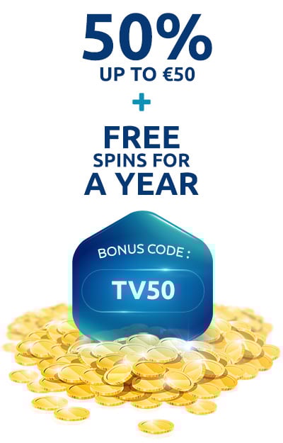 This offer is only available for the very first deposit of a user. A successful deposit with bonus code TV50 needs to be made to be eligible for free spins for a year. Requirements: Minimum deposit is €50, maximum bonus is €50. Benefits: Free Spins for a year + 50% Bonus. The weekly 10 free spins will be given either Thursdays or Fridays. WR of 30x Deposit Plus Bonus amount (only Slots count) within 30 days. Max bet is 10% (min €0.10) of the Bonus amount or €5 (lowest amount applies). WR 60x free spin winnings amount (only Slots count) within 30 days. Max bet is 10% (min €0.10) of the free spin winnings amount or €5 (lowest amount applies). Bonus Policy applies.